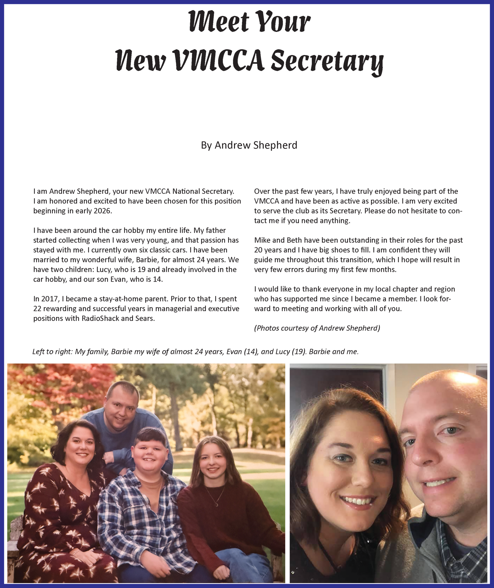 The Vintage Motor Car Club of America was established in 1938. We are managed by a Board of Governors, consisting of National Officers and Regional Directors, and the Past Presidents.